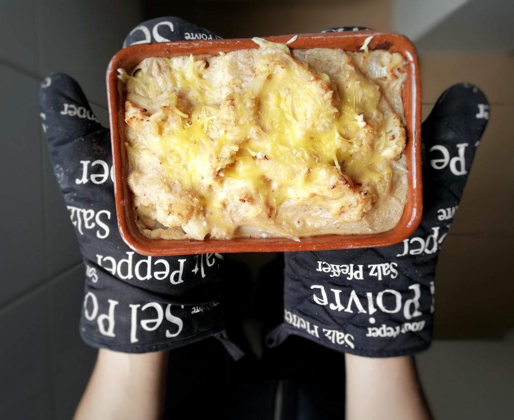 En una bandeja de horno, pon la coliflor escurrida. Báñala con la vegamel y espolvorea un poco de queso vegano. Métela en el horno para gratinar.